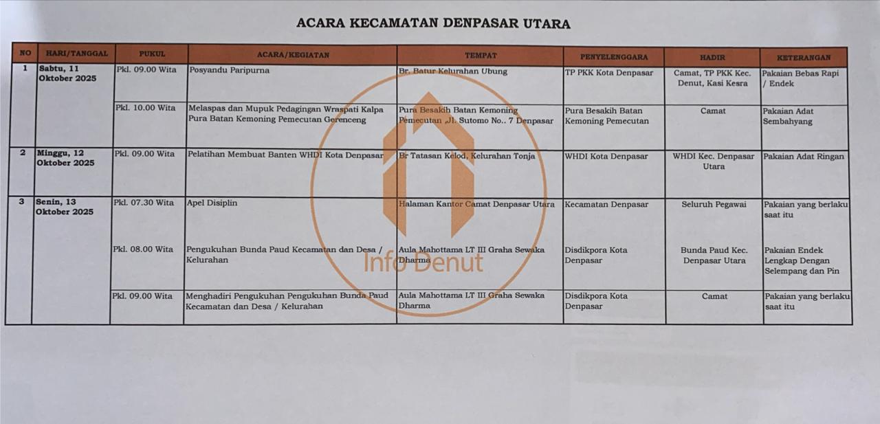Agenda Kecamatan Denpasar Utara dapat dilihat pada: Sabtu s/d Senin 11-13 Oktober 2025